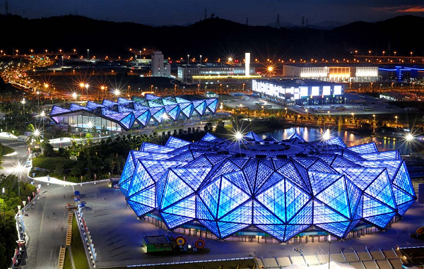 深圳大運(yùn)中心體育場館率先在國內(nèi)體育場館建設(shè)中引入以聚碳酸酯板(PC板)作為屋面材料面板,PC板是一種科技循環(huán)利用的高新低碳環(huán)保材料,相同厚度只有普通玻璃重量的50%,隔熱性能比普通玻璃提高了25%,沖擊強(qiáng)度時(shí)普通玻璃的250倍,并具有良好的透光性、抗沖擊性及耐紫外線輻射性能,同時(shí)還具有良好的尺寸穩(wěn)定性和成型加工系能。