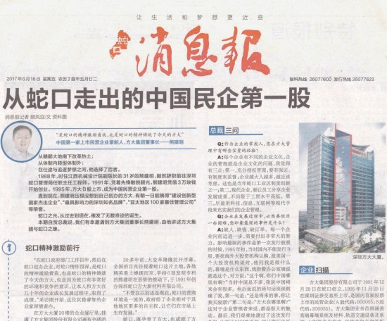6月16日,《蛇口消息報(bào)》刊登題為“從蛇口走出的中國(guó)民企第一股”專訪文章,重點(diǎn)報(bào)道國(guó)內(nèi)首家上市民營(yíng)企業(yè)——方大集團(tuán)股份有限公司作為蛇口精神的傳承者,成立26年來始終秉承“科技為本,創(chuàng)新為源”的經(jīng)營(yíng)理念,不忘初心,砥礪前行,在節(jié)能環(huán)保領(lǐng)域不斷取得令人矚目的成就。當(dāng)前,方大集團(tuán)正積極參與“一帶一路”國(guó)際合作和“粵港澳大灣區(qū)”建設(shè),大力拓展海外市場(chǎng),努力將方大高端幕墻系統(tǒng)、方大軌道交通站臺(tái)屏蔽門等創(chuàng)新成果推向全世界。