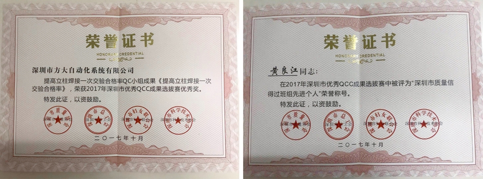 11月14日,深圳市第三十屆優(yōu)秀質(zhì)量管理小組活動(dòng)表彰大會(huì)在深圳市建科院舉行,方大集團(tuán)股份有限公司全資子公司深圳市方大自動(dòng)化系統(tǒng)有限公司“提高立柱焊接一次交驗(yàn)合格率QC小組”榮獲“2017年深圳市優(yōu)秀QCC成果選拔賽優(yōu)秀獎(jiǎng)”,自動(dòng)化公司質(zhì)量安全部黃良江榮獲“深圳市質(zhì)量信得過(guò)班組先進(jìn)個(gè)人”榮譽(yù)稱號(hào)。