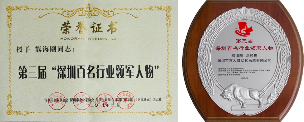 2017年12月,方大集團股份有限公司全資子公司深圳市方大自動化系統有限公司總經理熊海剛作為深圳城市軌道交通領域領軍人物代表當選“深圳百名行業領軍人物”。