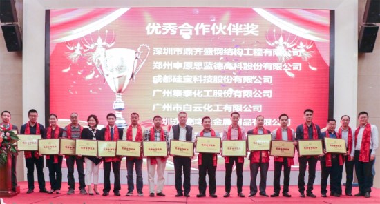 答謝會(huì)同時(shí)舉行了優(yōu)秀合作伙伴頒獎(jiǎng)典禮,表彰了2017年度在質(zhì)量、技術(shù)、服務(wù)等方面做出杰出貢獻(xiàn)的合作伙伴,江門(mén)耀皮工程玻璃有限公司等十五家企業(yè)榮獲優(yōu)秀合作伙伴獎(jiǎng)。