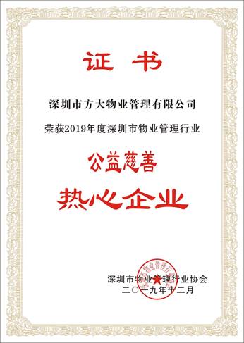 2019年度深圳市物業(yè)管理行業(yè)“優(yōu)秀企業(yè)”、“公益慈善熱心企業(yè)”評(píng)選由深圳市物業(yè)管理行業(yè)協(xié)會(huì)主辦,旨在鼓勵(lì)各物業(yè)管理企業(yè)積極開(kāi)展扶貧、濟(jì)困捐助等公益活動(dòng),樹(shù)立模范典型,發(fā)揮榜樣示范作用,促進(jìn)物業(yè)管理水平的提高,同時(shí)帶動(dòng)更多的企業(yè)和從業(yè)人員,高質(zhì)量地推進(jìn)行業(yè)發(fā)展。此次榮獲“優(yōu)秀企業(yè)”、“公益慈善熱心企業(yè)”兩個(gè)獎(jiǎng)項(xiàng),表明對(duì)方大物業(yè)及公司公益慈善工作的肯定。