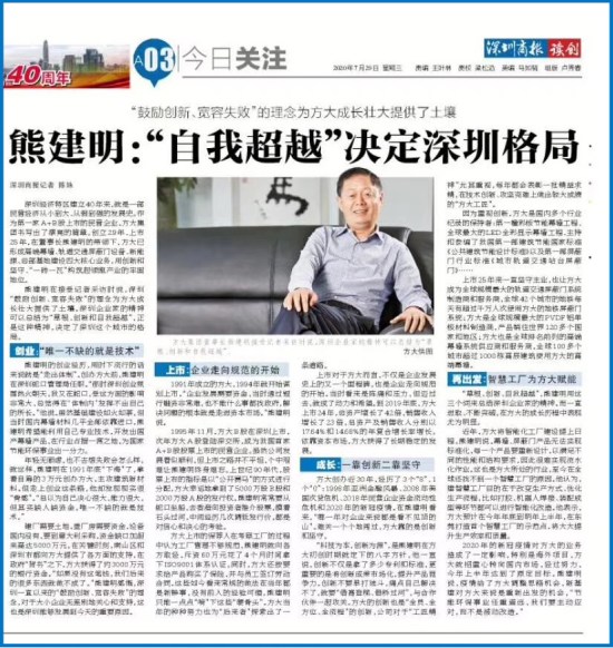 “草根、創(chuàng)新、自我超越”,熊建明用這三個(gè)詞來(lái)總結(jié)深圳企業(yè)家的精神。而一直進(jìn)取、不斷突破,在方大的成長(zhǎng)歷程中表現(xiàn)尤為明顯。
