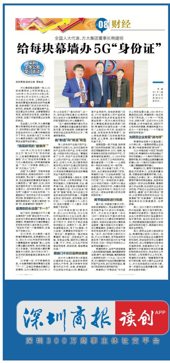 這30年來(lái),方大集團(tuán)一直深耕建筑幕墻領(lǐng)域。在熊建明內(nèi)心深處,他認(rèn)為1994年做的深圳新聞大廈幕墻具有“里程碑”意義。這棟大廈位置比較特殊,緊鄰深南大道鄧小平畫像。“深圳新聞大廈的幕墻是方大做的,到今天快30年了,在深圳的高樓里面還算是有點(diǎn)歷史了。”