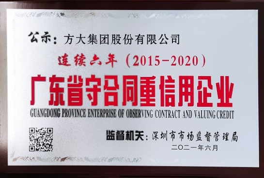 近日,廣東省市場監督管理局的2020年度“廣東省守合同重信用企業”評選揭曉,方大集團憑借優秀的公司治理及合同管理連續六年(2015-2020)榮獲“廣東省守合同重信用企業”稱號。